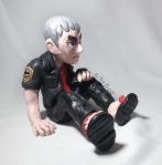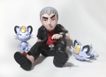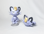 Nanu with Meowth, based on a drawing on Nanu’s model sheet. Nanu is just over 3 inches tall (roughly 8cm) and the Meowth are 2 and 1 inches (roughly 6 and 2.5cm) respectively. Polymer clay and acrylic paint.